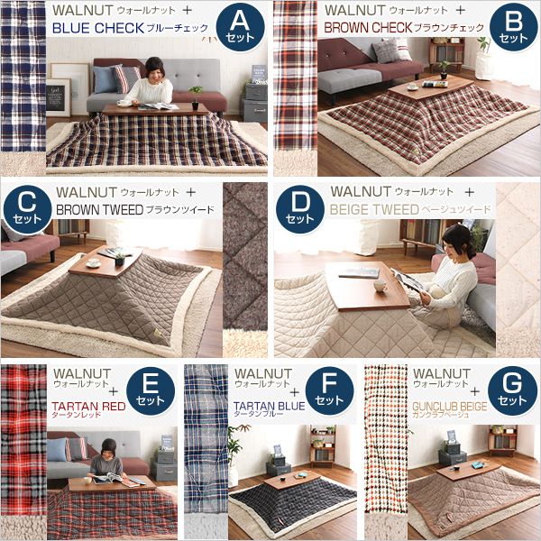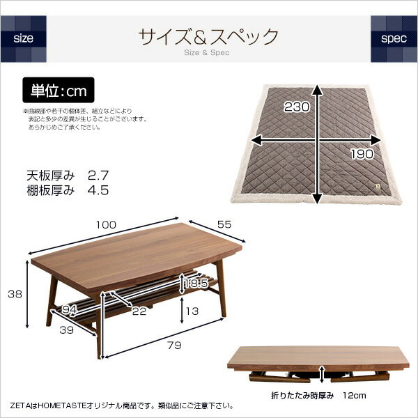 【商品について】こたつテーブル長方形+布団(7色)2点セット おしゃれなウォールナット使用折りたたみ式 日本製完成品|ZETA-ゼタ-■サイズ:(こたつ本体)外寸:(約)幅100x奥行き55x高さ38cm ※天板の厚み:2.7cm※商品重量:(約)17kg(こたつ布団) (約)190cmx230cm※商品重量: (約)4kg■カラー:Aセット Bセット Cセット DセットEセット Fセット Gセット■素材:天板:天然木化粧繊維板(ウォールナット)脚:天然木(ラバーウッド)表面加工:ウレタン塗装(こたつ掛け布団)ポリエステル100%■その他:・梱包サイズ:(約)106x71x18.5cm・梱包重量:(約)18kg(こたつ布団)・完成品でのお届けです。