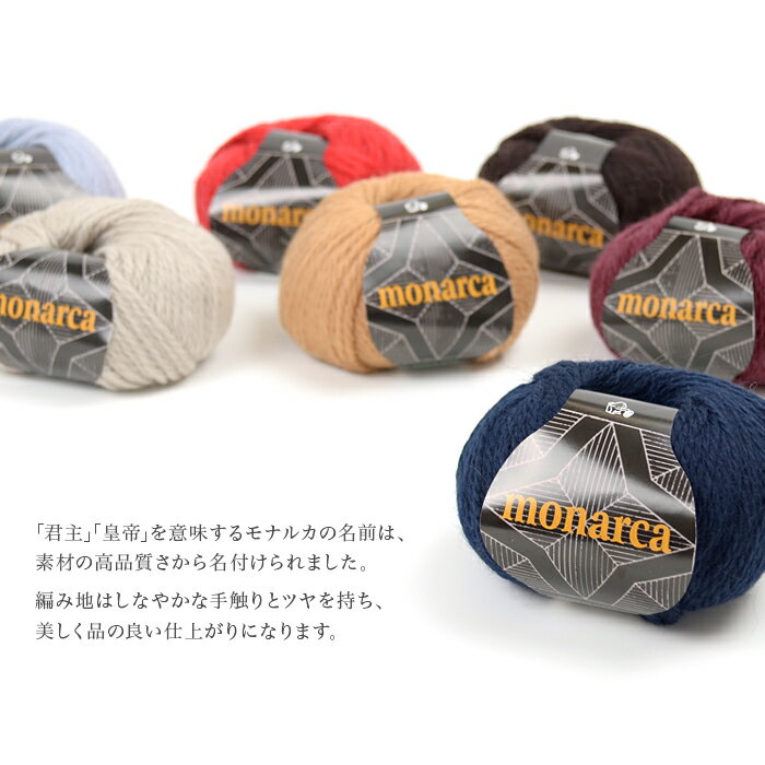 ブランド名 Puppy(パピー) 商品名 monaruka(モナルカ) 太さ 極太 仕立 50g玉巻(約89m) 素材 アルパカ70% ウール30% 使用針 棒針8号〜10号 かぎ針8/0号〜10/0号 ゲージ 棒針17〜18目23〜24段 標準使用量(メリヤス編み) ・婦人プルオーバー 400g ・紳士プルオーバー 500g ・婦人カーディガン 450g ・紳士カーディガン 600g 洗濯表示 商品説明 「君主」「皇帝」を意味するモナルカの名前は、素材の高品質さから名付けられました。