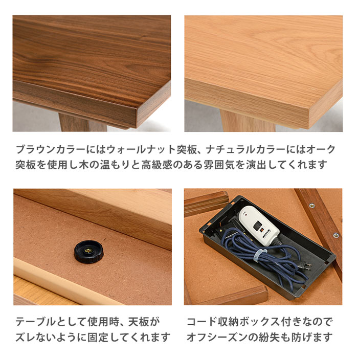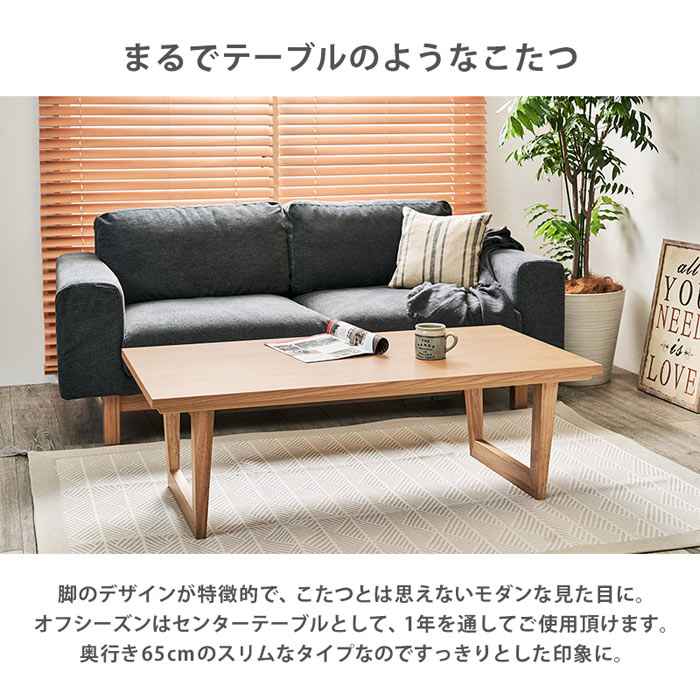 予めご了承くださいませ商品 サルトス こたつテーブル120 サイズ 幅1200×奥行き650×高400mm 素材 天板:天然木突板/天板UV加工 脚:ラバーウッド ヒーター MHU-600E 600WU字型ハロゲンヒーター(手元電子コントローラー) 温度調節:手元コントロール式 寸法:縦290×横290×高さ41mm ファン有 生産 - 完成品 (脚部のみ取り付け) 備考 個性的な脚のデザインがモダンな、こたつテーブル。