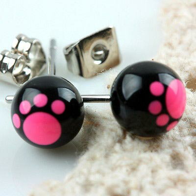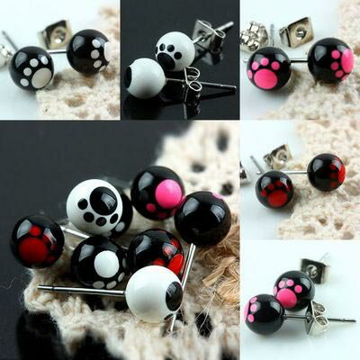 黒のボールに赤色で犬の足型をデザインしたプリカワなステンレスピアス。